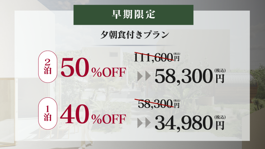 ①【早期限定】50%OFF 2泊3日 夕朝食付きプラン58,300円(税込)10枠