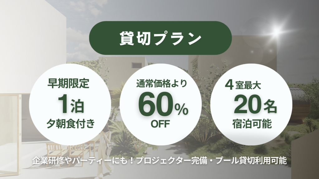 本施設の開業に先駆け、2月23日(月・祝)よりクラウドファンディングプラットフォーム「Makuake」にて特別価格・限定特典付きプランをご用意しました。本プロジェクトでは、早期限定で最大60%オフで日程を予約リクエストできるサポーターの募集を実施しております。